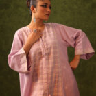 - Calf-length tassel tie-up dress in blush pink with intricate border Jamdani.