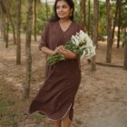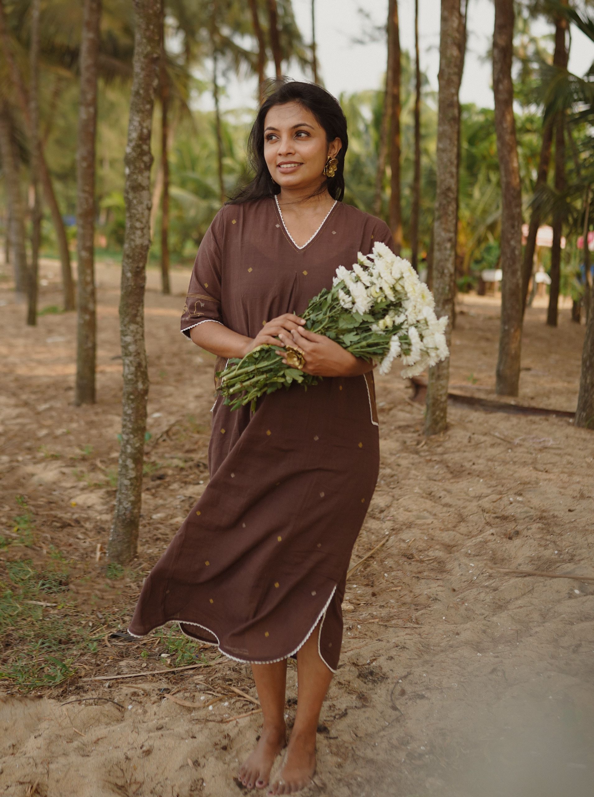 Amber is an anti-fit kurta dress in Brown Shiuli Jamdani, created for relaxed luxury and everyday poetry. Drops of Shiuli Jamdani in mustard and a hint of zari sit on an earthy base, making it feel like a wearable dusk.