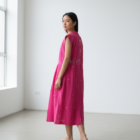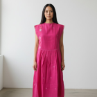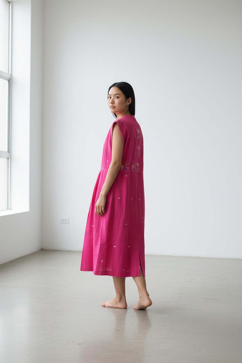 A bold interpretation of Bengal Jamdani, this high neck dress is handwoven in soft breathable cotton. Designed in a structured silhouette with box pleats from the waist, the bright pink base features striking patchwork placements of Bhomra’s pixelated lotus and hibiscus motifs, reflecting nature fractured into fragments.