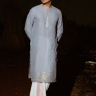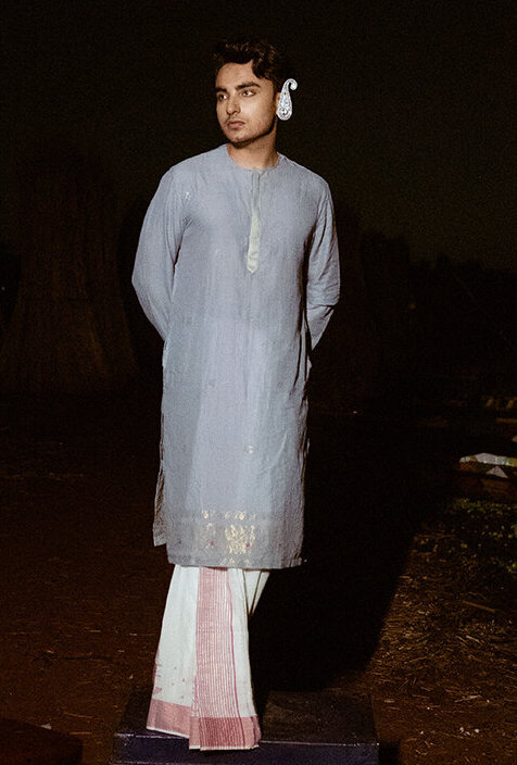 A refined celebration of understated elegance, this grey zari taant kurta balances simplicity with intricate craftsmanship. Rooted in tradition yet effortlessly wearable, it brings together delicate detailing and a classic silhouette for occasions that call for quiet sophistication.