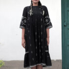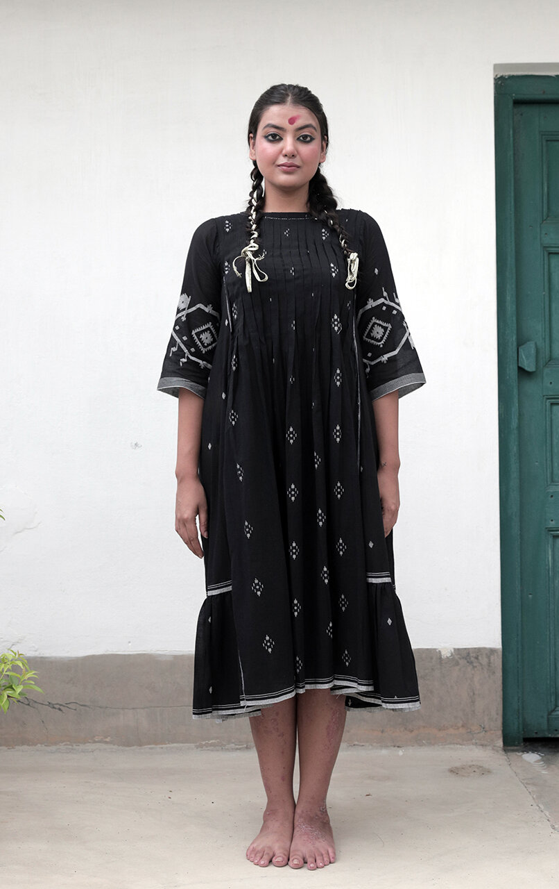 A timeless black Jamdani dress crafted in luxurious handwoven cotton, designed with structured box pleats and heritage border detailing. The side panels are detailed with netting and pinch gathers around the hemline. Elegant yet comfortable, this versatile silhouette transitions effortlessly across occasions.