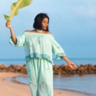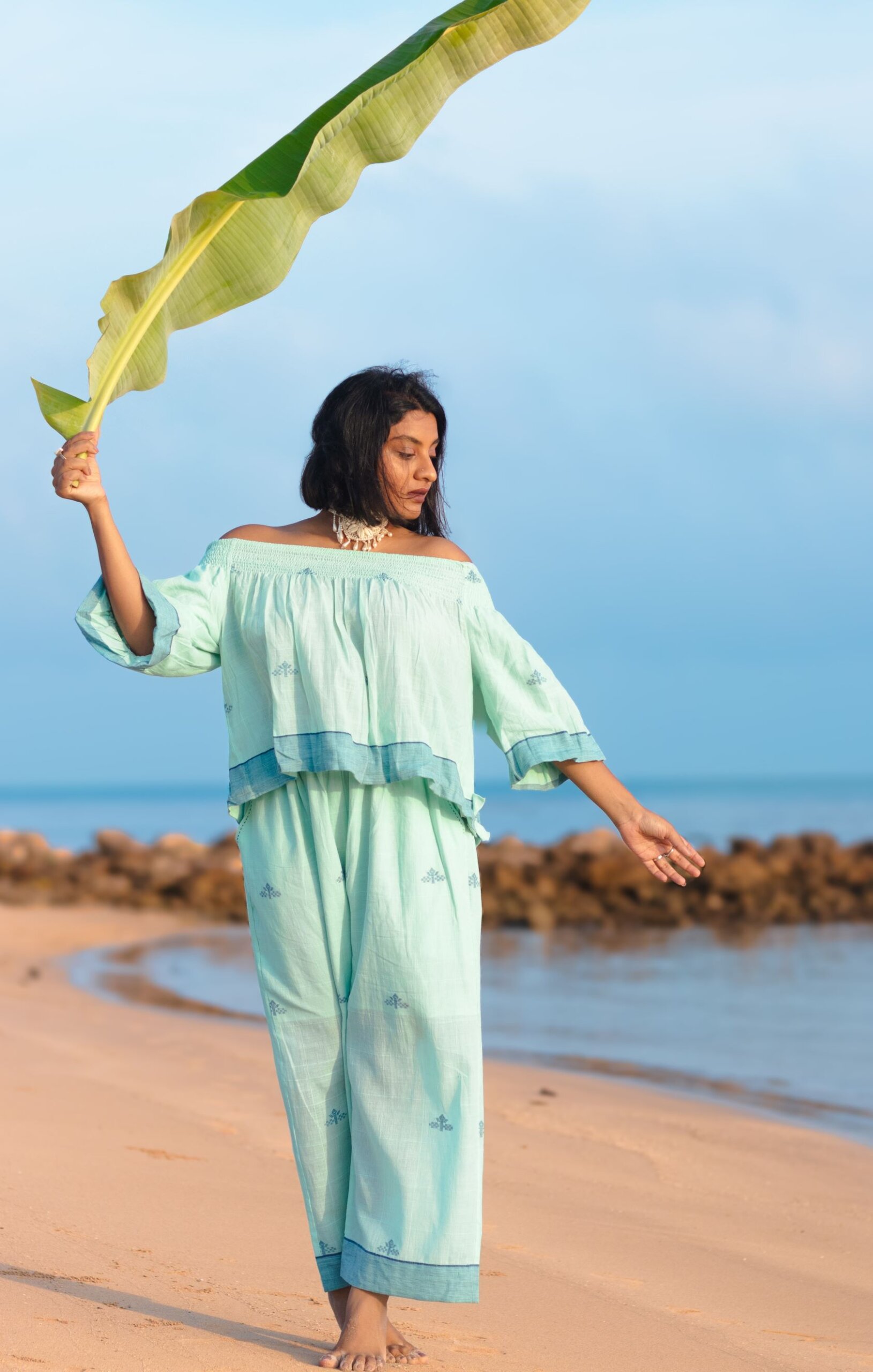 - Aquamarine base with self-check Jamdani motifs; Soft blue border detailing along the hemlines