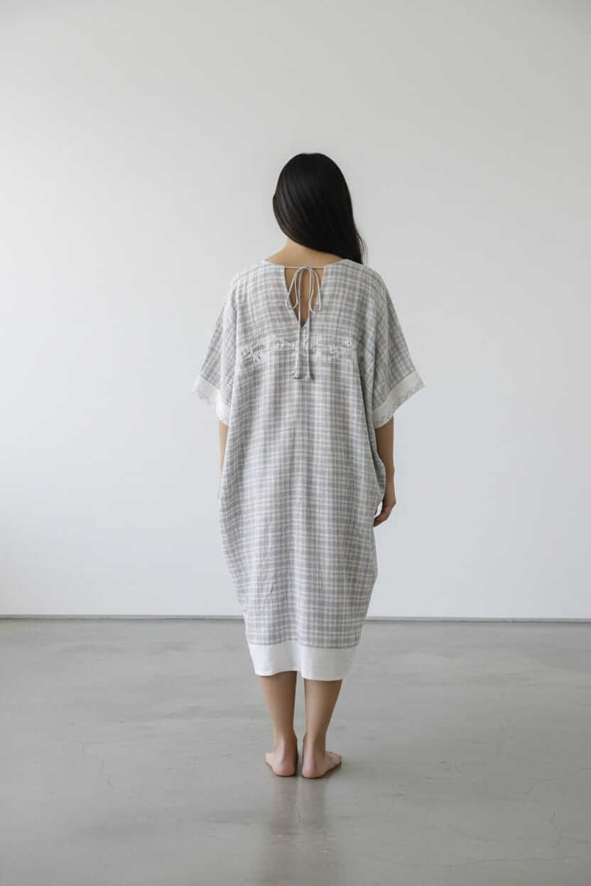 •Round neck dress with dolman sleeves and V tie-up back