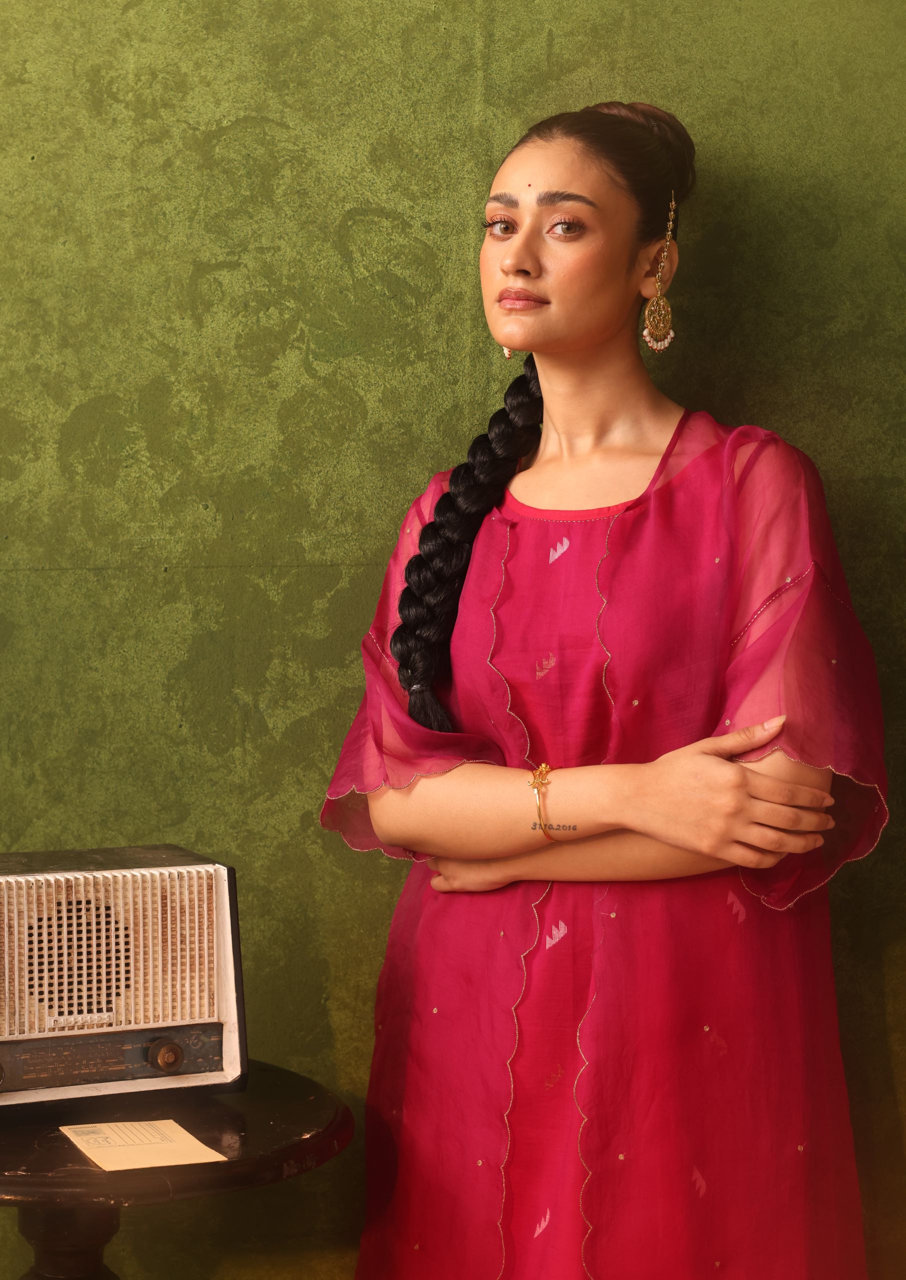 - Fabric: Hand woven pure silk organza in rich magenta.