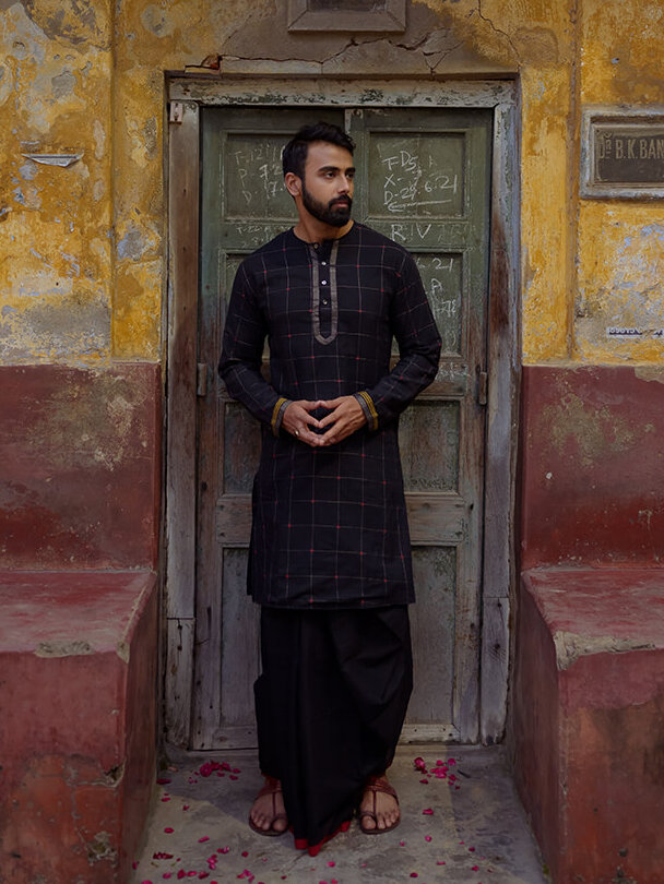 Fine handspun cotton kurta in silver zari checks and red dot jamdani. Comes with button detailing along neckline and bordered cuffs. Has pockets on both sides.