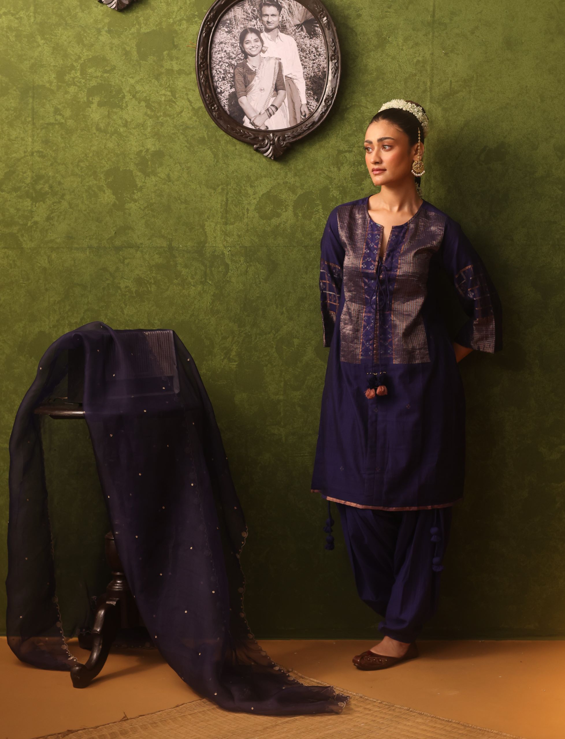- Colour: Deep indigo/midnight blue zari stripes that ground bright, metallic or neutral uppers.
